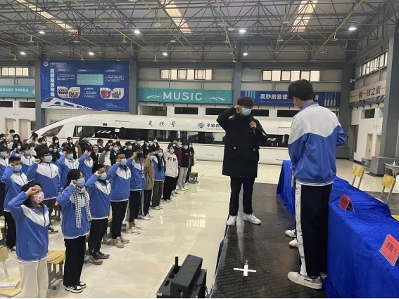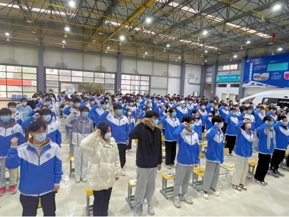 大會第一項,全體起立,所有學生身著校服、唱國歌。