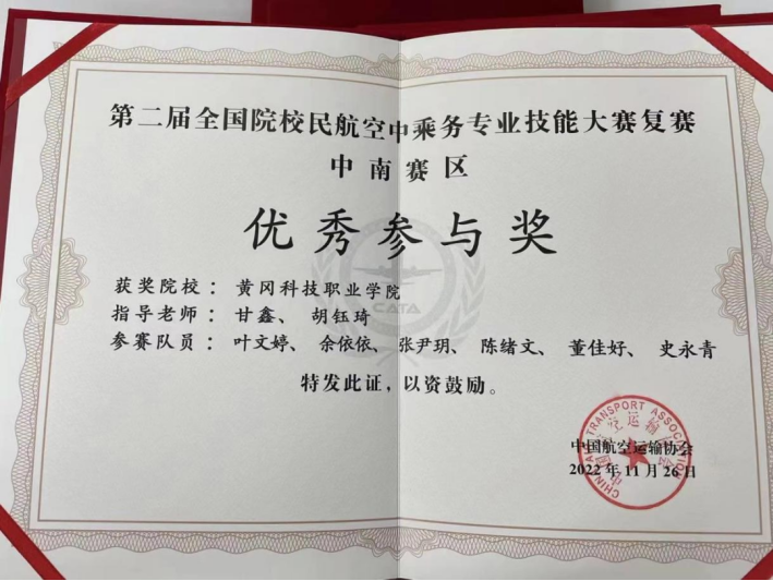 11月(yue)26日,第二屆(jie)全國院校民航(hang)(hang)空(kong)中乘務專業技能(neng)大賽中南區(qu)復賽在(zai)滁州(zhou)·華東航(hang)(hang)空(kong)實(shi)訓基地圓滿落幕,因疫(yi)情原因,黃岡科技職(zhi)業學院校區(qu)旅游(you)與航(hang)(hang)空(kong)服(fu)務學院民航(hang)(hang)空(kong)中乘務專業的學生未能(neng)線下參(can)加,只能(neng)通過有限(xian)的條件(jian)參(can)加線上比(bi)拼,最終獲(huo)得優秀獎。